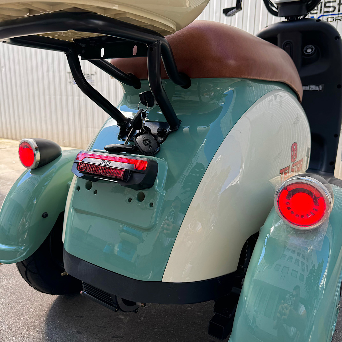 Допълнителна информация- задно предаване, с диференциал - клаксон - луксозна кожена седалка + луксозна кожена облегалка - брой места: 3- местна - спирачна система: 1 крачна и 2 ръчни спирачки за по-удобно спиране - 3 скорости - аварийни светлини - ГОЛЯМ дигитален LCD дисплей тип apple показващ над 5 параметъра - странични светлоотразители - задна скорост - пълна светлинна окомплектовка ( преден LED фар тип ЛУПА , мигачи- предни, задни, стопове, габарити) - клаксон - метална кошница за багаж отпред и отзад Подарък- огледала за задно виждане 2 броя при закупуване!