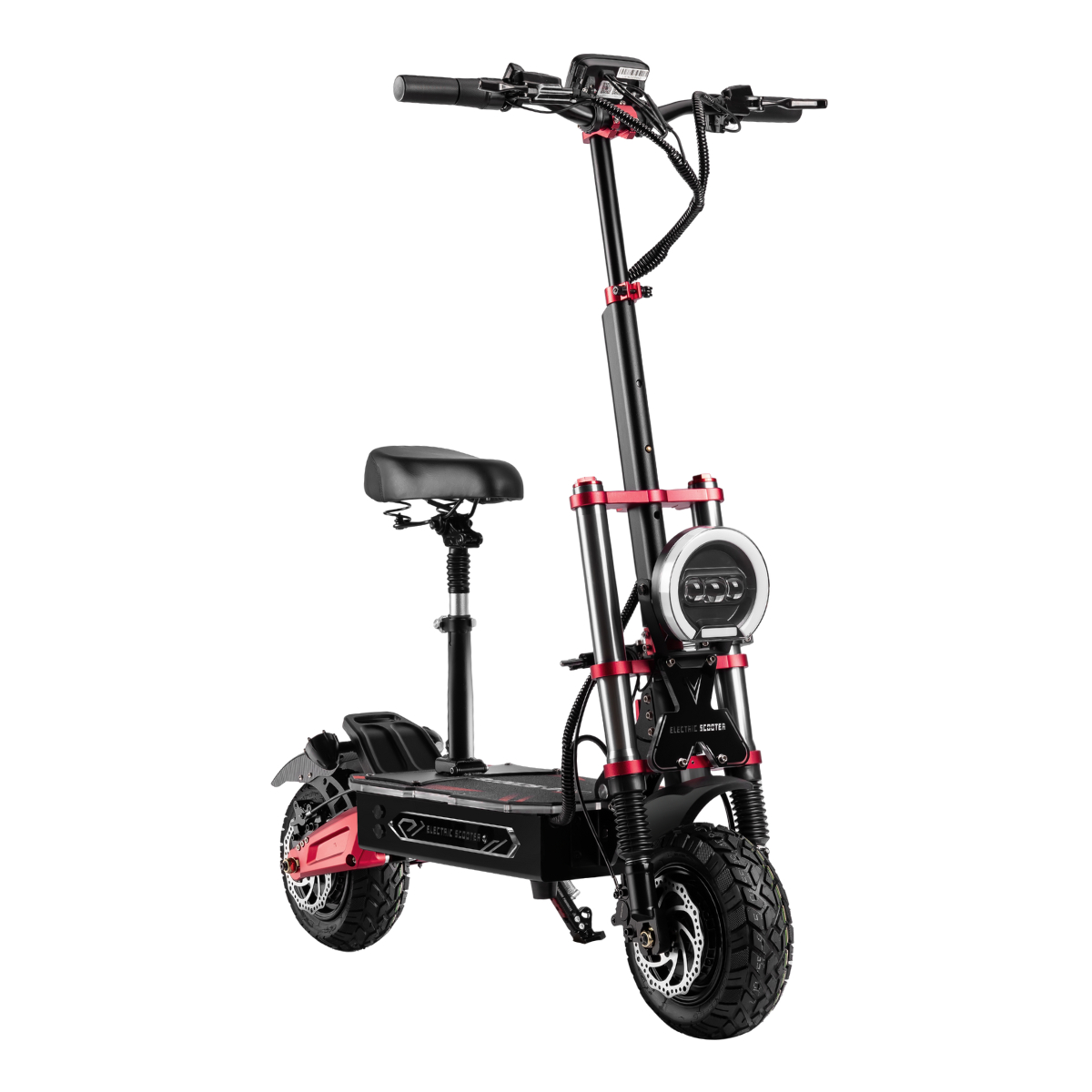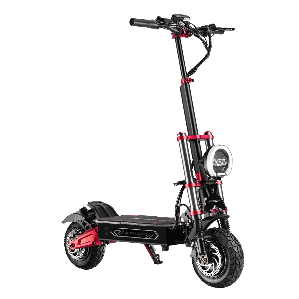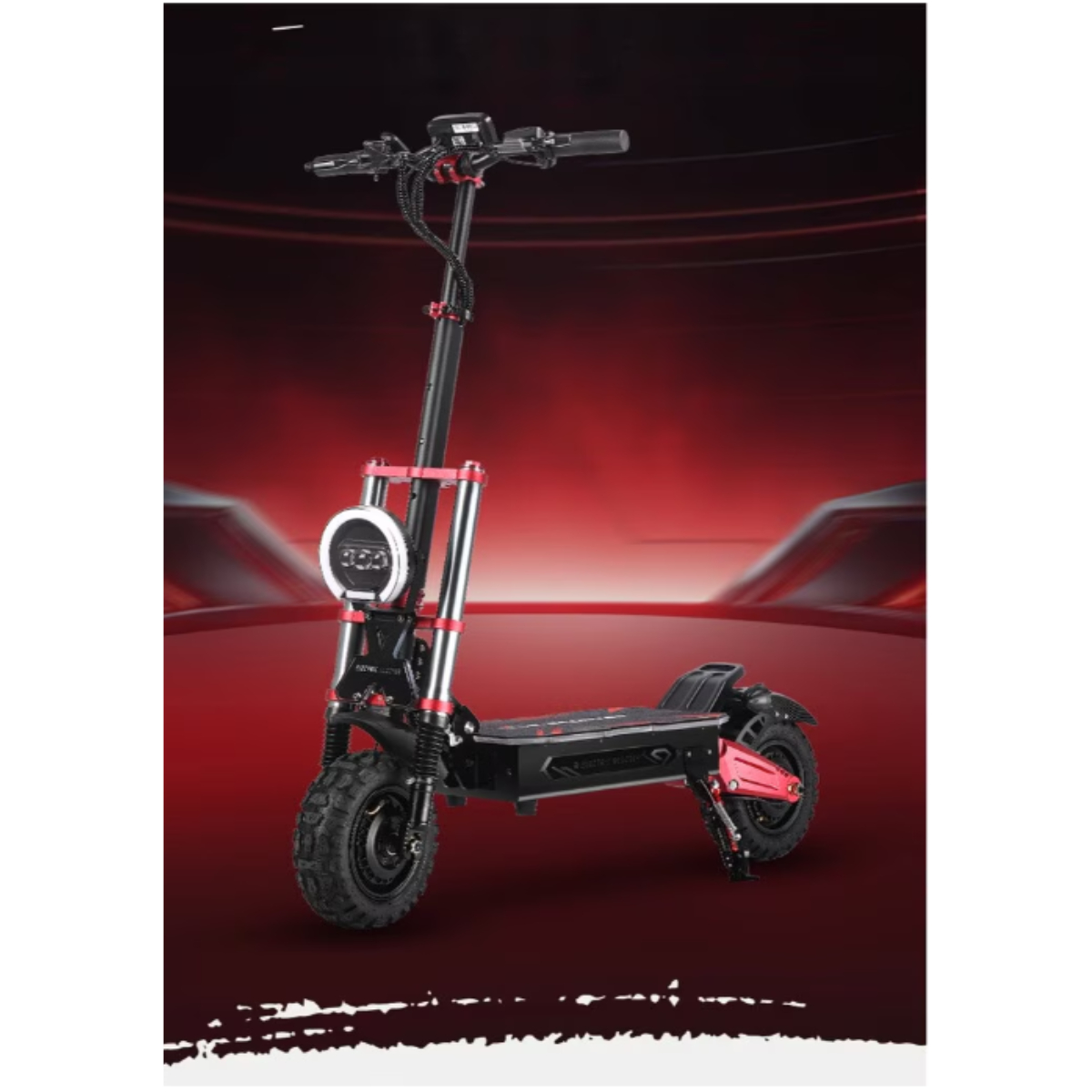 Високопроизводителна електрическа тротинетка с 2×3000 W мотора и батерия 60 V 38 Ah, осигуряваща пробег до 120 км. Създадена за офроуд приключения – с 11″ гуми, хидравлично окачване и здрав алуминиев корпус, тя предлага мощ, стабилност и комфорт на всякакъв терен. Това е излючително престижен скутер, който съчетава свободата и удобството на карането със способността за по-бързо придвижване в градски условия и офроуд терен.