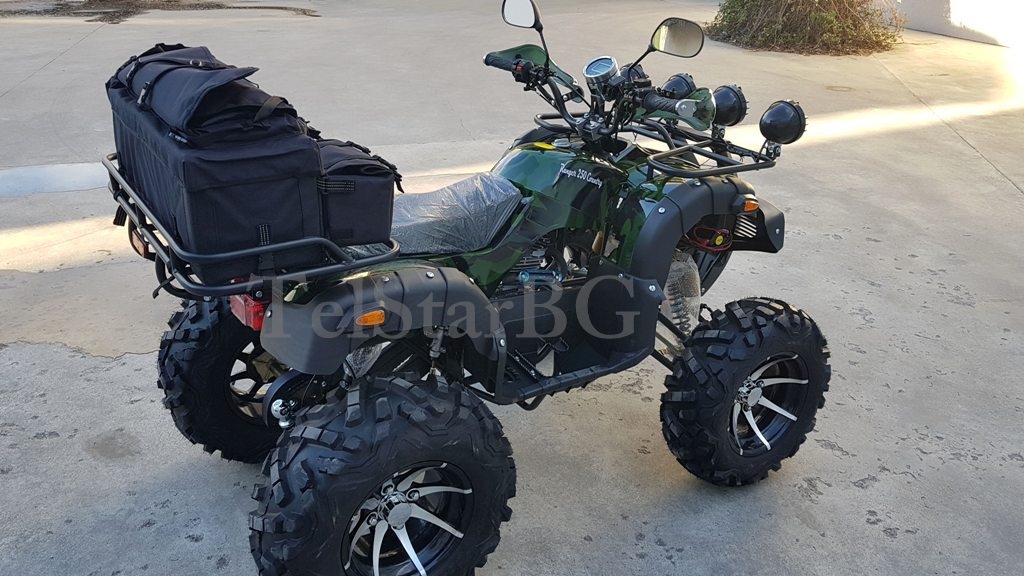 Допълнителна информация max. мощност: 13.0 / 7000 ± 150 (kw / об/мин.) max. въртящ момент: 8,8 / 5500 ± 150 (N.m / об/мин.) консумация гориво: ≤ 365g/kW/h нитовани сменяеми калници усилена конструкция усилена задна ос *с подарък при закупуване: теглич, издържащ до 1.6т. товар (на стойност 300лв.) предна лебедка, с товароносимост над 1т предни SUPERLED фарове *подарък при закупуване: 4бр. LED фарове за лов протектори за ръцете цифров километраж с показание за ниво на акумулатор, светлини, скорост, изминато разстояние, скорост и др. капацитет на масления резервоар: 1.5 L наклон на изкачване: ≥ 25 ° максимална скорост: 80 км/ч мощност: 25 к.с. *Чантата за АТВ-то е опционална на стойност 167лв. и не влиза в цената на модела.,АТВ са само за OFFROAD , не се регистрират и не са предназначени за каране по националната пътна мрежа ! Фирмата е взела решение, да не се предоставят атв и кросови мотори за движение по националната пътна мрежа, могат да се ползват и според наредба I.45 чл.1 (4) 3.